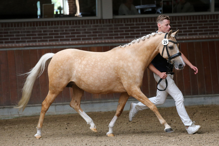 Salerno (stm. 1.56 m) stamt van de rijpaardhengst Sorento uit de elite ponymerrie Springflower (Vlegel x Lobeke ox x Brutus van de Meijershoeve). Hij wordt in de dressuursport uitgebracht en is niet eerder aangeboden voor stamboekopname, maar het was voor fokker Ad Gussinklo uit Westendorp nu wel interessant om de ster bij de ruin te krijgen, want daardoor kon de moeder preferent worden. De eigenaren waren bereid om met Salerno naar Lunteren te komen en werden beloond met een mooie beoordeling en het sterpredicaat.