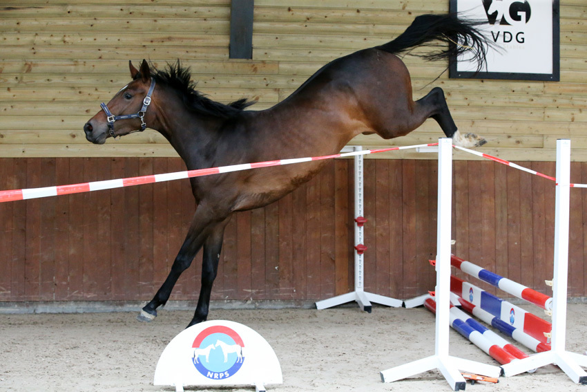 Er wordt van de dieren zeker niet teveel gevraagd – een paar rondjes in draf en galop, paar keer handveranderen, en voor de springen/ allround gefokte een lijntje van kruisje-steil-oxer. Waarbij nooit te hoog wordt gebouwd om de merries ‘uit te testen’! Het gaat om de aanleg en die is prima te beoordelen in een eenvoudig, laag lijntje.